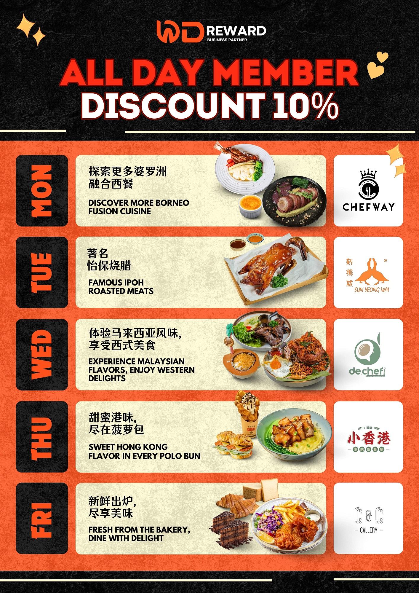 As WD Reward member, you are entitle to have 10% discount on every purchase at participated brand outlet from Monday to Friday. Just show your membership at cashier counter.